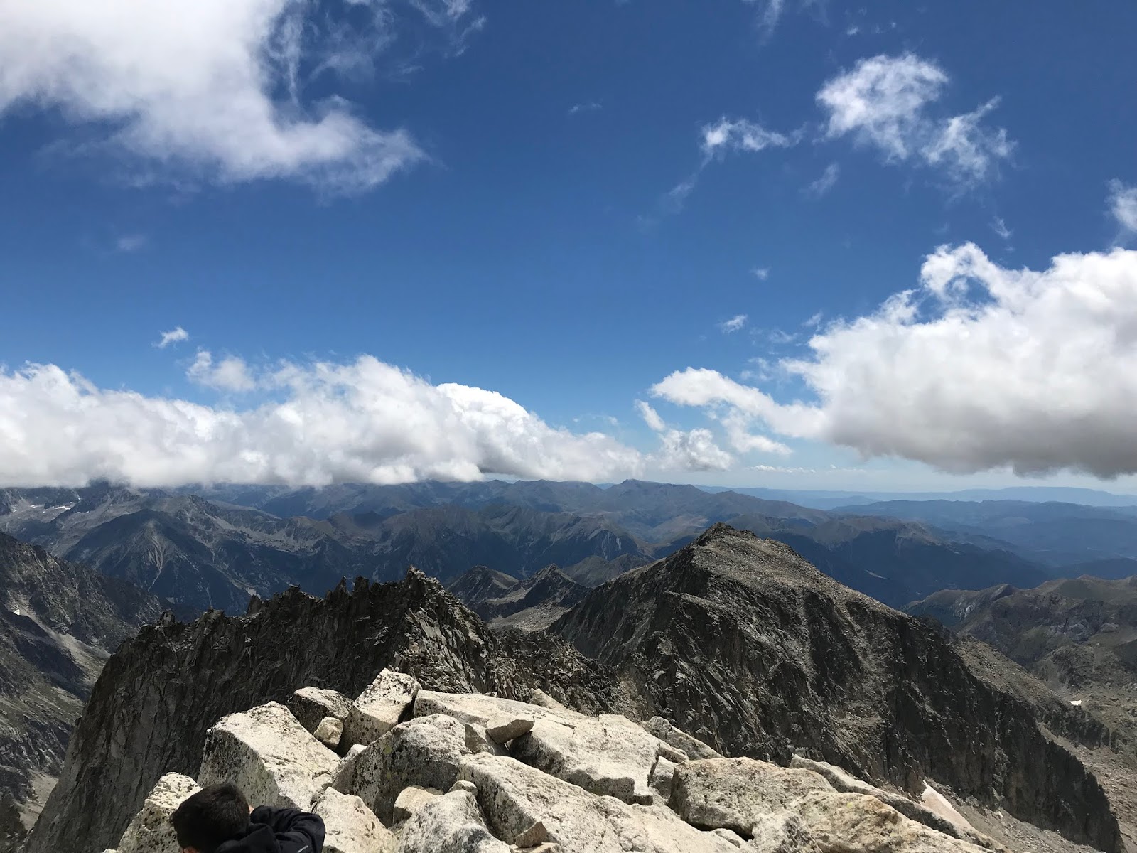 Una vez, en la cima, queda la cima del Aneto muy cercana, se puede ver la cruz, después de pasar una zona expuesta hacia la zona de Salemques, se llega hasta los 3.278m del Pico Tempestades.